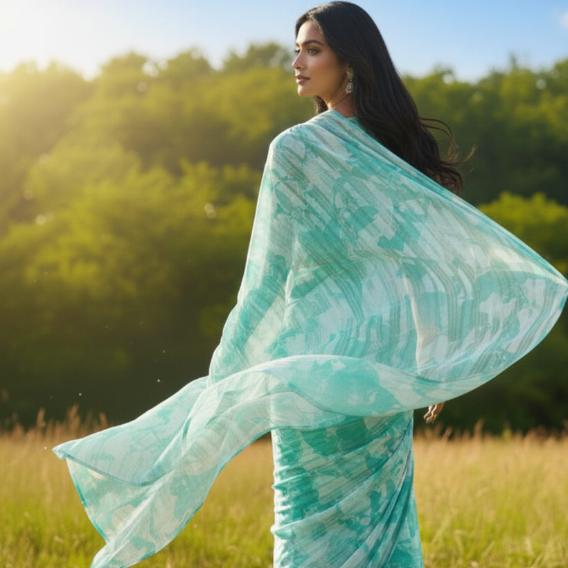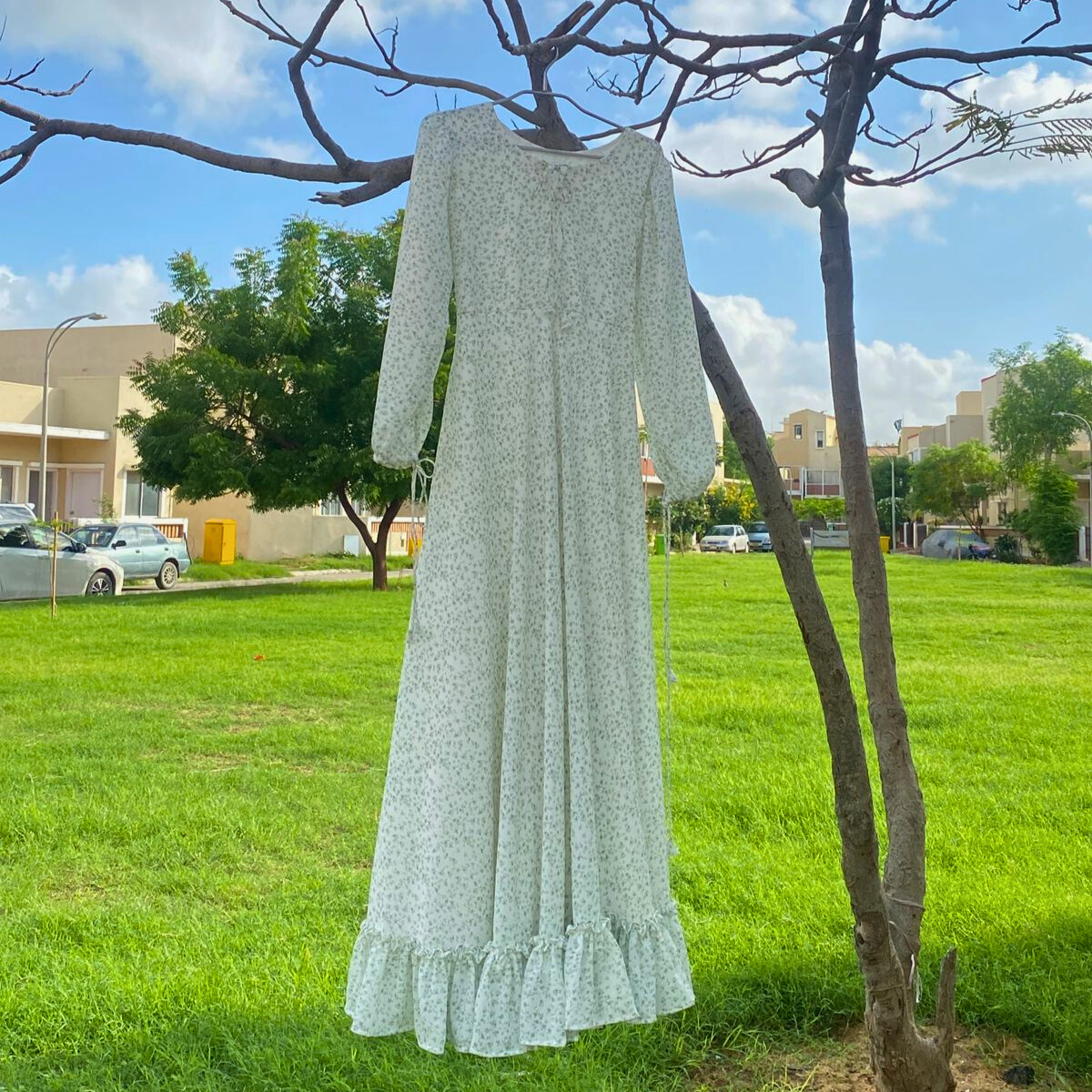 Style: Full-length dress with ruffled hemline Sleeves: Full-length puffy sleeves Fabric: Premium georgette (with lining) Fitting: Regular fit Color: Turquoise NOTE: Fabric colors may vary slightly under different lightings.