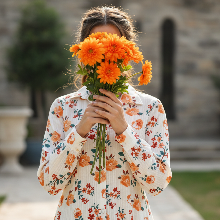 Style: Full-length dress Sleeves: Full-length cuffed sleeves Fabric: Premium embroidered cotton Fitting: Regular fit Color: White and Orange NOTE: Fabric colors may vary slightly under different lightings.