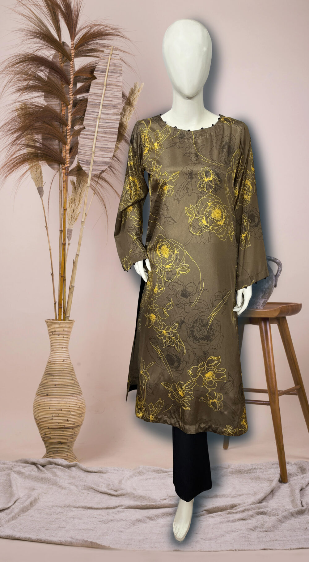 Abstract Strokes is made with premium silk georgette fabric that has a golden floral self-print on a wood brown base. It has a straight cut with a round neckline and slight bell sleeves, making it easy to wear for both casual and formal looks. The neckline and sleeve edges are finished with delicate bead detailing.