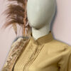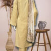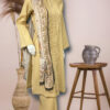 A minimalistic and elegant beige solid 2-piece outfit featuring a long kurta with a design enhanced with lace detailing front slit and pleats along the length, paired with straight trousers. The full sleeves are finished with lace accents. Perfect for a graceful and sophisticated everyday look.