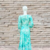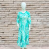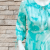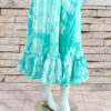 Coral Crush a Turquoise Frock which is an elegant dress beautifully merges comfort with style. Crafted from a lightweight, flowy fabric, it features a soft green and white abstract pattern that adds a refreshing touch. The dress showcases a flattering A-line silhouette with a ruffled hemline, offering a graceful and feminine flair. The full-length sleeves are slightly puffed, adding volume and a classic appeal, while the tie-neck detail at the front enhances its delicate charm. Perfect for both casual outings and semi-formal gatherings, this dress is a versatile addition to your wardrobe.