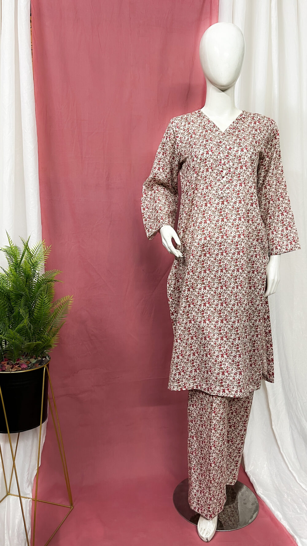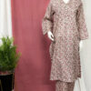 A comfortable and elegant two-piece outfit designed for everyday wear. The set includes a long printed shirt with a subtly embellished V-neckline and straight trousers. Made from soft printed fabric, it offers a relaxed fit and a neat look, making it suitable for casual outings and daily use.